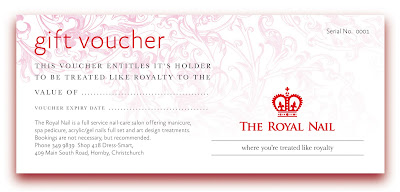 Vouchers available from our salon. If you live out of town, hold a New Zealand bank account and would like to purchase a gift voucher online, please email us for information about this. Alternatively, you can make a cheque out to The Royal Nail and post it to: The Royal Nail, Shop 8, BNZ Centre, 120 Hereford Street, Christchurch 8011. Please include a note stating the dollar amount or amounts you would like on each gift voucher (or vouchers), and let us know your mailing address. As soon as your cheque has been cleared by our bank, we’ll post out your gift voucher/vouchers.
